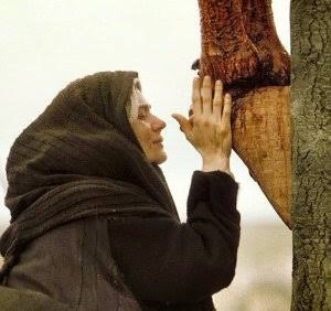 De camino al Gólgota con la cruz a cuestas, horriblemente descuartizado, María lo encuentra. Bastó una mirada. Un abrazo en que lágrimas y sangre se fundieron. María comparte los sentimientos de la madre que visita a su hijo enfermo en el hospital, preso en la cárcel o que deambula por su adicción a las drogas y el licor. Las palabras sobran, los abrazos y besos abundan. Y las miradas nubladas de lágrimas de amor también.