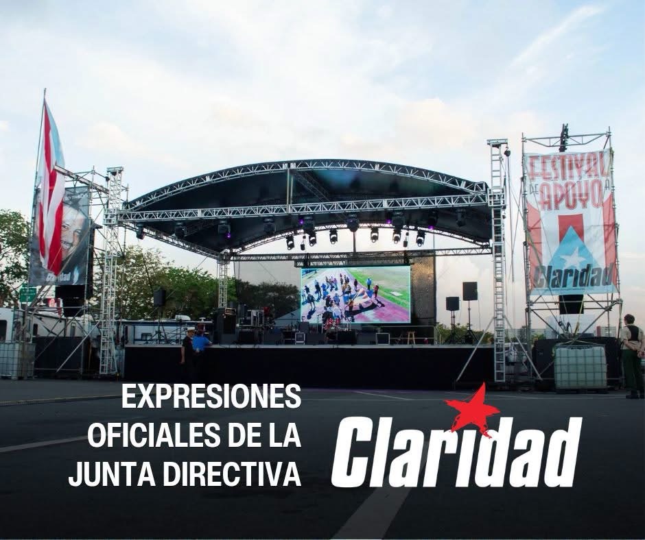 La Junta Directiva del Periódico Claridad expresa su más sentido repudio e indignación ante la violación al derecho de libertad de expresión de parte del gobierno municipal de San Juan al bajar las banderas de Lares y Palestina desplegadas en los terrenos del Festival de Apoyo a Claridad. El evento fue uno privado y se celebró durante el pasado fin de semana en el estacionamiento del Estadio Hiram Bithorn.